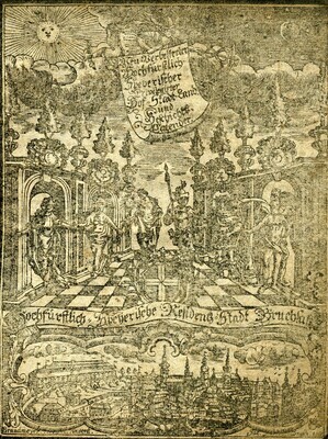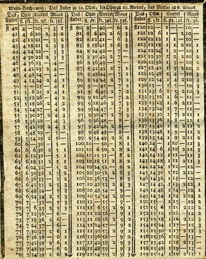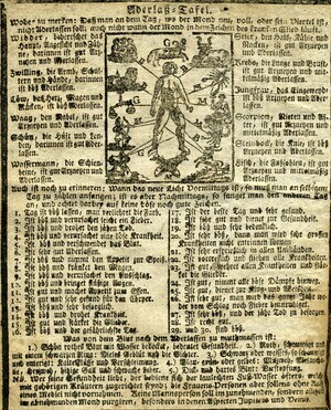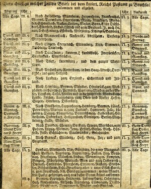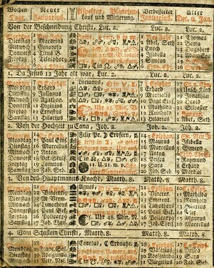 Der volkstümliche Kalender enthält Tabellen zu den verschiedenen Zeitrechnungsarten (gregorianisch, jüdisch), Aufschlüsselung der verwendeten Symbole, Auflistung verschiedenster in der Vergangenheit liegender Ereignisse, Daten zu Sonnen- und Mond- Auf- bzw. Untergang, Finsternissen und Besonderheiten der Planeten, astrologische Praktika für das Jahr, Monatsseiten, Ratschläge zur Gartenarbeit und Leerseiten für persönliche Eintragungen. 32 Blätter, gedruckt bei Jakob Bevern, Hof- und Kanzleidruckerei in Bruchsal. Das Deckblatt ist in zwei unterschiedlich große Holzstiche aufgeteilt. Der untere und kleinere zeigt eine Ansicht der Stadt Bruchsal. Darüber steht auf einem langen, schmalen Banner „Hochfürstlich Speyerische Residenz-Stadt Bruchsal“. Im Zentrum des größeren Stichs sind sechs Personen, die in einem Halbkreis stehen. Aufgrund der Attribute in ihren Händen, wie z.B. eine Mondsichel und eine Sonne handelt es sich vermutlich um Personifikationen. Im Hintergrund sind je links und rechts zwei Säulenreihen zu sehen, die mit architektonischen Elementen, die an Rocaillen erinnern geschmückt sind. In deren Mitte sind weitere astrologische Symbole, die eine Deutung der Personen ermöglichen. Es sind von links beginnend, die Symbole für Mond, Venus, Jupiter und Saturn. Oberhalb der Szene schwebt der Götterbote Merkur, zu erkennen an seinem Stab aus zwei umschlungenen Schlangen mit zwei Flügeln und weiteren Flügeln an den Füßen. In der Hand hält er ein großes Banner mit der Aufschrift „Neu-verbesserter Hochfürstlich Speyerischer Privilegirter Hof- Stadt- Land- und Geschichts-Calender“. Links von Merkur ist die Sonne, rechts der Mond im Sternenhimmel. Verzeichnis wann die Post in Bruchsal ankommt und abgeht. Schreiben des Bischofs Verzeichnis der Mitglieder des Domstifts. Flüssigkeitsmaßtabellen (Fuder in Ohm) für Wein. Umrechnungstabellen. Verzeichnis der Messen, Jahr- und Viehmärkte. Aderlasstabellen.
