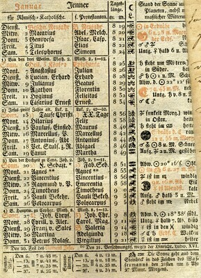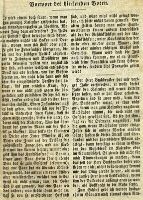 Kalender und Almanache waren bis zum 19. Jh. ein populäres Lektüremedium für breite Bevölkerungsschichten. In Straßburg wurden sogar mehrere dieser Kalender verlegt. Der große Straßburger Hinkende Bote erschien bei Le Roux. Wie einige andere Verleger in frankophonen Gebieten gab Le Roux mit dem Grand Messager boitteux de Strasbourg auch eine französische Ausgabe des Kalenders mit identischen, lediglich übersetzten Inhalten heraus. Wie für die Gattung der Volkskalender üblich, enthält der Große Straßburger Hinkende Bote einen Kalender nach verschiedenen Zeitrechnungen und so genannte astrologische Praktika (auf Astrologie beruhende Wettervorhersagen und Anweisungen), Termine für Messen und Märkte in der Region, Anekdoten, Platz für eigene Eintragungen, historische Begebenheiten und politische Neuigkeiten. Die Ausgabe von 1828 enthält außerdem eine Tabelle mit den Departements Frankreichs samt ihrer Hauptstädte, eine Auflistung der Mitglieder des Hauses Bourbon sowie eine Auflistung des Verwaltungs- und Gerichtspersonals des Niederrheins. Auf dem Titelblatt des Straßburger Kalenders ist der namengebende "Hinkende Bote" abgebildet. Häufig waren es invalide Soldaten oder ausgediente Handlanger, die versuchten, sich als Kolporteure von Nachrichten und Geschichten oder als Verkäufer von Volkskalendern ein Auskommen zu sichern. Kalender mit "hinkenden Boten" im Titel waren vor allem im südwestdeutschen Raum, der Schweiz und dem Elsass verbreitet. [Johanna Kätzel]