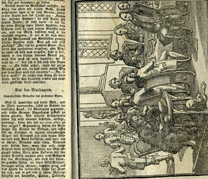 Kalender und Almanache waren bis zum 19. Jh. ein populäres Lektüremedium für breite Bevölkerungsschichten. In Straßburg wurden sogar mehrere dieser Kalender verlegt. Der große Straßburger Hinkende Bote erschien bei Le Roux. Wie einige andere Verleger in frankophonen Gebieten gab Le Roux mit dem Grand Messager boitteux de Strasbourg auch eine französische Ausgabe des Kalenders mit identischen, lediglich übersetzten Inhalten heraus. Wie für die Gattung der Volkskalender üblich, enthält der Große Straßburger Hinkende Bote einen Kalender nach verschiedenen Zeitrechnungen und so genannte astrologische Praktika (auf Astrologie beruhende Wettervorhersagen und Anweisungen), Termine für Messen und Märkte in der Region, Anekdoten, Platz für eigene Eintragungen, historische Begebenheiten und politische Neuigkeiten. Die Ausgabe von 1828 enthält außerdem eine Tabelle mit den Departements Frankreichs samt ihrer Hauptstädte, eine Auflistung der Mitglieder des Hauses Bourbon sowie eine Auflistung des Verwaltungs- und Gerichtspersonals des Niederrheins. Auf dem Titelblatt des Straßburger Kalenders ist der namengebende "Hinkende Bote" abgebildet. Häufig waren es invalide Soldaten oder ausgediente Handlanger, die versuchten, sich als Kolporteure von Nachrichten und Geschichten oder als Verkäufer von Volkskalendern ein Auskommen zu sichern. Kalender mit "hinkenden Boten" im Titel waren vor allem im südwestdeutschen Raum, der Schweiz und dem Elsass verbreitet. [Johanna Kätzel]