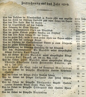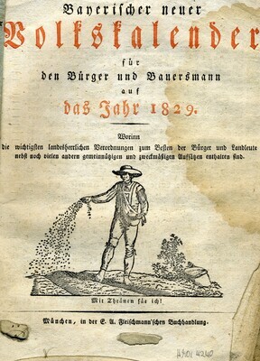 Der volkstümliche Kalender enthält Tabellen zu den verschiedenen Zeitrechnungssystemen (gregorianisch, jüdisch), Aufschlüsselung der verwendeten Symbole, Auflistung verschiedenster in der Vergangenheit liegender Ereignisse, Daten zu Sonnen- und Mond- Auf- bzw. Untergang, Finsternissen und Besonderheiten der Planeten, astrologische Praktika für das Jahr, Monatsseiten, Ratschläge zur Gartenarbeit, und Leerseiten für persönliche Eintragungen. 48 Blätter, gedruckt und verlegt in der E. A. Fleischmann´schen Buchhandlung, München. Auf dem Deckblatt ist ein Stich eines Pflugs zu sehen mit einem Stempel darüber. Kirchenrechnung, Bewegliche Feste, Beginn der Jahreszeiten. Allerhöchst- landesherrliche Verordnung. Erzählungen und Geschichten. Wohlfahrtskunde und Gesundheitskunde. Aberglaube und Vorurteile. Anekdoten. Liste der Jahrmärkte.
