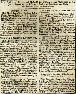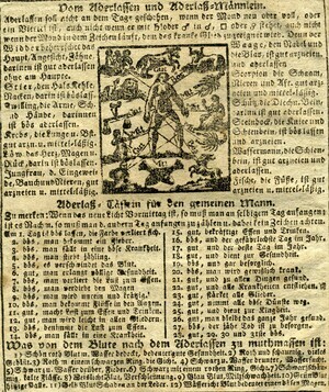 Kalender und Almanache waren bis zum 19. Jh. ein populäres Lektüremedium für breite Bevölkerungsschichten. Eine sehr lange Tradition kann der Offenbacher Hinkende Bote aufweisen, der (in unterschiedlichen Abwandlungen) auch mit "Der Hinkend- und Stolpernd- doch eilfertig fliegend- und laufende Reichs-Bott" betitelt war. Spätestens seit 1698 nachweisbar, war er einer der am weitesten verbreiteten Quartkalender in Südhessen, der auch überregional und sogar in deutschsprachigen Gemeinden in den USA rezipiert wurde. Im frühen 19. Jh. wurde der Kalender von Heinrich Gottlieb Hauch verlegt, dem Hofbuchdrucker von Isenburg-Birstein, das von 1806 bis 1815 zum Rheinbund gehörte. Wie bei Volkskalendern üblich, enthält der Offenbacher Hinkende Bote einen Kalender nach verschiedenen Zeitrechnungen und so genannte astrologische Praktika (auf Astrologie beruhende Wettervorhersagen), Anweisungen zum Aderlass, Termine für Messen und Märkte in der Region, Anekdoten, Platz für eigene Eintragungen, historische Begebenheiten und politische Neuigkeiten. Die Ausgabe von 1815 zeigt außerdem in zwei Holzschnitten die Schlacht von Paris am 30. März 1814 und den Einzug der Koalitionsarmee in Paris am 31. März 1814. Im April folgte darauf die Abdankung Napoleons. Das Titelblatt des Offenbacher Kalenders bildet den namengebenden "Hinkenden Boten" ab: einen Mann mit Holzbein in Soldatenuniform. Häufig waren es invalide Soldaten, die versuchten, sich als Kolporteure von Nachrichten oder als Verkäufer von Volkskalendern ein Auskommen zu sichern. Die abgebildete Schnecke symbolisiert die Langsamkeit des Boten, die ihn jedoch gerade als eine vertrauenswürdige Quelle erscheinen ließ. Kalender mit "hinkenden Boten" im Titel waren vor allem im südwestdeutschen Raum, der Schweiz und dem Elsass verbreitet. [Johanna Kätzel]