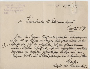 Brief an die Kommandantur des Gefangenenlagers Landau vom 14. Juli 1915 "Einem im hiesigen Bereich untergebrachten Zivilgefangenen, welcher bis vor Kurzem im dortigen Gefangenenlager untergebracht war, sind die beigefügten Anlagen abgenommen worden. Derselbe behauptet, daß die aufgeführten weiblichen Personen in lebhaftem gesellschaftlichem Verkehr mit den dortigen Zivil- und Militärgefangenen gestanden hätten.", 2 Seiten, gefaltet. Beigefügte Anlagen, ein Zettel mit drei Adressen sowie ein Foto, siehe HM_0_9225_2 und HM_0_9225_3