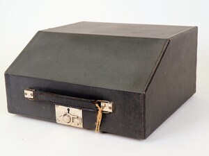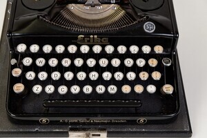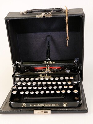 Die Firma Seidel und Neumann aus Dresden, produziert seit 1900 Schreibmaschinen. Zu Beginn war es die große Büromaschine der Marke IDEAL, ab 1910 folgte die kleine Reise- oder Kleinschreibmaschine der Marke Erika. Nach 1945 wurde die Firma enteignet und in die spätere VEB Robotron eingegliedert. Unsere Maschine ist eine „Erika 5 neu“ aus den Jahren 1938/1939, worauf die Produktionsnummer 770 643/5 schließen lässt. Die Bezeichnung "neu" hinter dem Namen ist auf eine Besonderheit zurück zu führen. Da das Nachfolgemodell die "Erika 6" floppte, griff die Firma Seidel und Neumann auf das bewährte Modell 5, nun aber mit dem Zusatz "neu", zurück. Dies Modell wurde in verschiedenen Varianten bis Ende des Krieges produziert. Technisch handelt es sich um eine Typenhebelschreibmaschine mit Wagnergetriebe, 4 reihiger Tastatur, Zeilenschalthebel, Bandumschaltung und einer Q-W-E-R-T Tastatur. Obwohl einige Tasten, sich farblich absetzen und mit englischen Sonderzeichen belegt sind, handelt es sich wohl nicht um eine klassische Exportversion. Diese führten den Namen Bijou statt Erika. Die Maschine wird von einem festen Koffer aus Sperrholz geschützt, der mit schwarzem, textilverstärktem Papier bezogen ist. Die Schreibmaschine in einem sehr guten Zustand und schreibt problemlos. Der dazugehörige Koffer hat normale Gebrauchspuren.