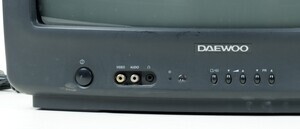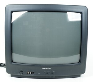 Ein kleiner Farbfernseher mit einem 20 Zoll Bildschirn. Er empfängt alle Programme in Farbe. Unterhalb des Bildschirm ist das Bedienfeld Ein/Aus, Lautstärke und Kanalwahl. Anschlüsse sind für Video/Audio und Kopfhörervorhanden