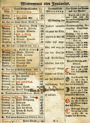 Der volkstümliche Kalender enthält Tabellen zu den verschiedenen Zeitrechnungsarten (gregorianisch, jüdisch), Aufschlüsselung der verwendeten Symbole, Auflistung verschiedenster in der Vergangenheit liegender Ereignisse, Daten zu Sonnen- und Mond- Auf- bzw. Untergang, Finsternissen und Besonderheiten der Planeten, astrologische Praktika für das Jahr, Monatsseiten, Ratschläge zur Gartenarbeit, und Leerseiten für persönliche Eintragungen. 28 Blätter, gedruckt in der kurfürstlichen Hof- und Akademiedruckerei Mannheim. Rüge eines landwirtschaftlichen Vorurteils bezüglich Leinsamen und "Liefländer" Flachs. Übersicht des am Rhein geführten Krieges gegen die Franzosen 1792-1795. Verzeichnis aller Messen und Märkte in der kurfürstlichen Pfalz am Rhein.