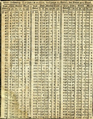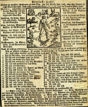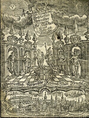 Der volkstümliche Kalender enthält Tabellen zu den verschiedenen Zeitrechnungssystemen (gregorianisch, jüdisch), Aufschlüsselung der verwendeten Symbole, Auflistung verschiedenster in der Vergangenheit liegender Ereignisse, Daten zu Sonnen- und Mond- Auf- bzw. Untergang, Finsternissen und Besonderheiten der Planeten, astrologische Praktika für das Jahr, Monatsseiten, Ratschläge zur Gartenarbeit, und Leerseiten für persönliche Eintragungen. 34 Blätter, gedruckt und verlegt von Jakob Bevern, Hof- und Kanzleidruckerei Bruchsal. Das Deckblatt ist in zwei unterschiedlich große Holzstiche aufgeteilt. Der untere und kleinere zeigt eine Ansicht der Stadt Bruchsal. Darüber steht auf einem langen, schmalen Banner „Hochfürstlich Speyerische Residenz-Stadt Bruchsal“. Im Zentrum des größeren Stichs sind sechs Personen, die in einem Halbkreis stehen. Aufgrund der Attribute in ihren Händen, wie z.B. eine Mondsichel und eine Sonne handelt es sich vermutlich um Personifikationen. Im Hintergrund sind je links und rechts zwei Säulenreihen zu sehen, die mit architektonischen Elementen, die an Rocaillen, erinnern geschmückt sind. In deren Mitte sind weitere astrologische Symbole, die eine Deutung der Personen ermöglichen. Es sind von links beginnend, die Symbole für Mond, Venus, Jupiter und Saturn. Oberhalb der Szene schwebt der Götterbote Merkur, zu erkennen an seinem Stab aus zwei umschlungenen Schlangen mit zwei Flügeln und weiteren Flügeln an den Füßen. In der Hand hält er ein großes Banner mit der Aufschrift „Neu-verbesserter Hochfürstlich Speyerischer Privilegirter Hof- Stadt- Land- und Geschichts-Calender“. Links von Merkur ist die Sonne, rechts der Mond im Sternenhimmel. Zeiten der Ankunft und Abfahrt der Post. Aufzählung der Mitglieder des Domkapitels. Pferdekrankheiten. Flüssigkeitsmaßtabellen (Fuder in Ohm) für Wein. Umrechnungs- und Zinstabellen. Liste der Messen und Jahrmärkte. Aderlasstafeln.