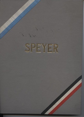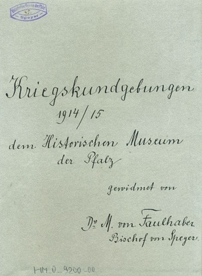 Mappe mit dem Aufdruck "Speyer", Beschriftung auf der Deckelinnenseite: "Kriegskundgebungen 1914/15, dem Historischen Museum der Pfalz gewidmet von Dr. M. von Faulhaber, Bischof von Speyer"