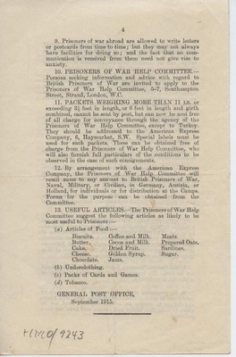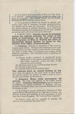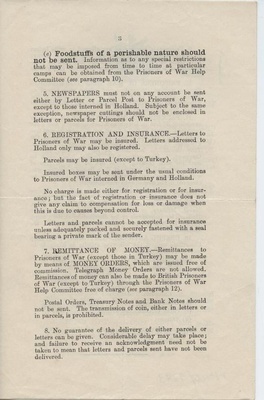 "Communication with prisoners of war interned abroad", enthält Hinweise, wie Brief-, Paket, und Geldsendungen an Kriegsgefangene auszusehen haben, 4 Seiten, gefaltet