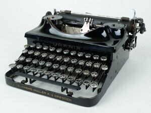 Der Unternehmer Clemens Müller, aus Dresden, startete, als Erster in Deutschland, eine sehr erfolgreiche Nähmaschinenproduktion. Der Geschäftsbereich wurde ab 1909 auf Schreibmaschinen ausgeweitet. Der Büroschreibmaschine „URANIA 1“ folgte 1921 die „URANIA 4“ von der, bis 1928, jährlich 8.528 Stück hergestellt wurden. Der Erfolg seines Wettbewerbers, Seidel und Naumann, mit der Kleinschreibmaschine „ERIKA“ veranlassten Clemens Müller ebenfalls dieses Segment in die Produktion auf zu nehmen. Es waren die Modelle „Perkeo“ (1912) gefolgt von URANIA-Piccola“ (1925) und der eine „Klein-URANIA“ ab 1935. Bei unserem Modell handelt es sich um eine „Klein Urania“, die 1938 hergestellt wurde. Die seitlich eingestanzte Produktionsnummer 176 746 kann eindeutig dem diesem Herstellungsjahr zugeordnet werden. Die Maschine hat eine 4 Reihige QWERT Tastatur, ist mit einer automatischen Bandumschaltung, einem Zeilenschalter und Rücktaste ausgestattet. Leider wurde von einem Hobbybastler im Innern, der Hebemechanismus des Farbbandes beschädigt, was aber reparabel wäre. Rein technisch handelt es sich um eine Typenhebelschreibmaschine mit Wagnergetriebe und Wagenumschaltung. Zwischen Groß- und Kleinschrift wird, entweder durch Absenken des Segments (Segmentumschaltung) oder durch Anheben des Wagens (Wagenumschaltung), gewählt.