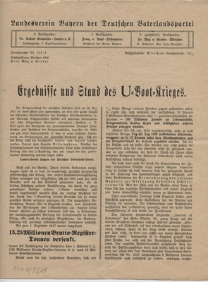 Mitteilungsblatt des Landesvereins Bayern der Deutschen Vaterlandspartei, Titel: "Ergebnisse und Stand des U-Boot-Krieges", 8 Seiten, gefaltet; Münchener Handelsdruckerei, Karlstraße 41