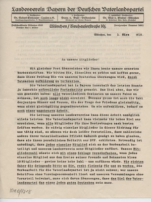 Rundschreiben an die Mitglieder des Landesvereins Bayern der Deutschen Vaterlandspartei vom 1. März 1918, welches zu verstärkter Werbetätigkeit aufruft.