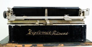 Die "Kleine Olympia" (Originalname) wurde unter verschiedenen Bezeichnungen vertrieben. Eine davon ist unsere Kleinschreibmaschine mit Namen „Diplomat-Präsent“ aus dem Jahr 1934 worauf die Produktionsnummer 031250 schließen lässt. Technisch gesehen handelt es sich um eine transportable Typenhebelmaschine mit einer 4 Reihigen QWERT Tastatur sowie Zeilenschaltung, Rücktaste, einfacher Umschaltung und Vorderaufschlag. Das Einschalten der Großschrift erfolgt durch die Anhebung des Wagens (Wagenumschaltung). Erwähnenswert ist die Art und Weise der Farbbandumschaltung. Diese erfolgte manuell mit Hilfe eines Schlüssels mit dem das Farbband zurückgespult wurde. Unterhalb der Leertaste steht der Name: "Schreibmaschinenfabrik Erfurt" Die Maschine ist fest mit der Bodenplatte des Koffers verbunden. Der Koffer, aus Sperrholz gefertigt und mit schwarzem Textilgewebe bezogen. Er weist stärkere Gebrauchsspuren auf und der Griff wurde durch eine Schnur ersetzt. Im Gegensatz dazu ist die Maschine in einem guten Zustand und schreibt heute noch perfekt. (SCHRIFTBILD) Schreibmaschinen dieser Art wurden bis kurz vor Ende des Zweiten Weltkriegs produziert.
