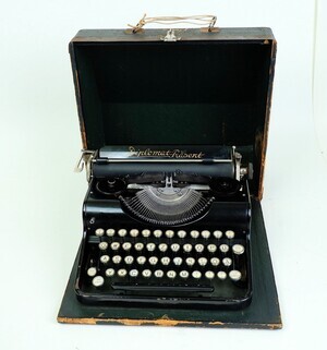 Die "Kleine Olympia" (Originalname) wurde unter verschiedenen Bezeichnungen vertrieben. Eine davon ist unsere Kleinschreibmaschine mit Namen „Diplomat-Präsent“ aus dem Jahr 1934 worauf die Produktionsnummer 031250 schließen lässt. Technisch gesehen handelt es sich um eine transportable Typenhebelmaschine mit einer 4 Reihigen QWERT Tastatur sowie Zeilenschaltung, Rücktaste, einfacher Umschaltung und Vorderaufschlag. Das Einschalten der Großschrift erfolgt durch die Anhebung des Wagens (Wagenumschaltung). Erwähnenswert ist die Art und Weise der Farbbandumschaltung. Diese erfolgte manuell mit Hilfe eines Schlüssels mit dem das Farbband zurückgespult wurde. Unterhalb der Leertaste steht der Name: "Schreibmaschinenfabrik Erfurt" Die Maschine ist fest mit der Bodenplatte des Koffers verbunden. Der Koffer, aus Sperrholz gefertigt und mit schwarzem Textilgewebe bezogen. Er weist stärkere Gebrauchsspuren auf und der Griff wurde durch eine Schnur ersetzt. Im Gegensatz dazu ist die Maschine in einem guten Zustand und schreibt heute noch perfekt. (SCHRIFTBILD) Schreibmaschinen dieser Art wurden bis kurz vor Ende des Zweiten Weltkriegs produziert.