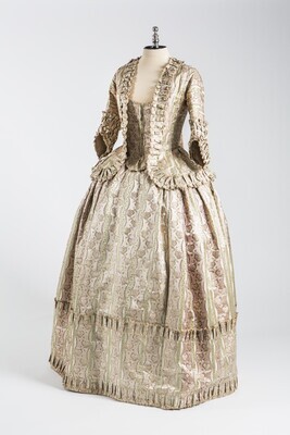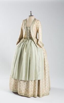 Der obere Teil des Rock des Kleides ist vorne geöffnet, um den unteren Stoff sichtbar werden zu lassen. Nach hinten ist der Rock länger und bildet eine in Falten gelegte Schleppe aus. Vorne reicht der Stoff nicht bis auf den Boden und lässt die Füße frei. Das Oberteil hat vorne und hinten eine breite Schneppe. Die Schnürung des Oberteils ist vorne unter der Falte versteckt. Der Rand des viereckigen Halsausschnitts ist mit einem Band aus Jacquard verziert. Die Ärmel sind dreiviertellang und eng anliegend. Das Kleid besteht aus blassgrüner Seide und Leinen. Verziert ist das Kleid mit einem Muster aus kleinen Blumen. Das Gesellschaftskleid wurde von Apollonia Jordan (1753-1797) getragen.