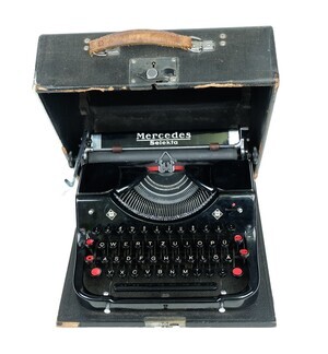 Die Mercedes-Bureau-Maschinen G.m.b.H wurde 1906 in Berlin gegründet. Für den Gebrauch des Markennamen Mercedes, wurde von den Daimler-Motorenwerken eine Lizenz erworbenen. 1908 siedelte sich das Unternehmen in Mehlis/Thüringen an, wo auch die Produktion von Schreib- und Rechenmaschinen aufgenommen wurde, die erst nach dem 2. Weltkrieg endete. Danach hieß das Unternehmen VEB Cellatron Büromaschinenwerk Zella-Mehlis geändert. 1990 wurde der Betrieb aufgelöst; alle Gebäude am Standort des ehemaligen Mercedes-Werkes wurden abgerissen Nach 1930 waren auch Kleinschreibmaschinen im Programm. Dazu zählen die Prima, die Superba oder auch unser Modell die Selekta. Der hochglänzende, schwarze Lack mit goldfarbener Beschriftung verleiht der Maschine eine besondere Hochwertigkeit. Es gibt einige Besonderheiten, die erwähnenswert sind. So muss zum Farbbandwechsel die vorhandene Abdeckung erst entriegelt, dann seitlich weggedreht werden. Der Randsetzer bzw. -löscher wird mittels zweier Tasten, die links und rechts der Leertaste angeordnet sind, bedient. (siehe Bild) Der schnelle Wagenrücklauf, erfolgt per Tastendruck, unterhalb der Rücktaste. Für die Wagenfeststellung gibt es eine weitere Taste, die oberhalb der Großschreibung angebracht wurde. Technisch handelte es sich um eine Typenhebelmaschine mit Vorderaufschlag und Wagnergetriebe. Ausgestattet mit einer 4 reihigen QWERT Tastatur, automatischer Bandumschaltung, einer Zeilenschaltung und Rücktaste.
