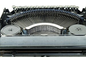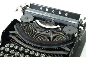 Die Adlerwerke waren ein deutsches Fahrzeug- und Maschinenbauunternehmen mit Sitz in Frankfurt am Main, das Fahrräder, Autos, Motorräder und zuletzt bis 1998 Büromaschinen herstellte. Im Jahr 1956 kaufte Max Grundig die Adlerwerke. Die Motorradfertigung wurde eingestellt und Adler wurde mit dem ebenfalls Grundig gehörenden Nürnberger Motorrad- und Büromaschinenbauer "Triumph" zusammengeschlossen. Produziert wurden nunmehr ausschließlich Büromaschinen unter dem Fabrikat "Triumph-Adler". Die Adlerwerke vorm. H. Kleyer AG aus Frankfurt, baute unser Modell, eine Adler Favorit, ca 1935. Die Produktionsnummer lautet 514 320. Bei unserem Modell handelt es sich um eine mittelgroße Stoßstangenmaschine. Bei diesem Maschinentyp werden die Buchstaben horizontal gegen die Schreibwalze geschoben bzw. gestoßen. Der große Vorteil dieses Typs, war die geringe Bauhöhe. Vor allem die damals beliebten und weit verbreiteten Reiseschreibmaschinen konnten sehr klein, leicht und kompakt gebaut werden. Die Schreibmaschine ist sehr gut erhalten. Der schwarze, hochglänzende Lack, mit den goldfarbenen Aufschriften ADLER und FAVORIT sowie dem Firmen Logo, verleihen der Maschine eine hochwertige Optik. Die Mechanik leidet unter der Verschmutzung und funktioniert nur sehr eingeschränkt.
