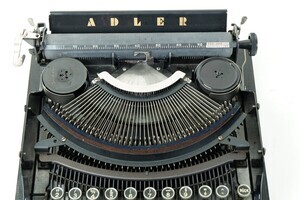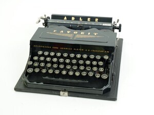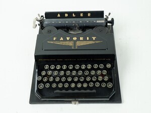 Die Adlerwerke waren ein deutsches Fahrzeug- und Maschinenbauunternehmen mit Sitz in Frankfurt am Main, das Fahrräder, Autos, Motorräder und zuletzt bis 1998 Büromaschinen herstellte. Im Jahr 1956 kaufte Max Grundig die Adlerwerke. Die Motorradfertigung wurde eingestellt und Adler wurde mit dem ebenfalls Grundig gehörenden Nürnberger Motorrad- und Büromaschinenbauer "Triumph" zusammengeschlossen. Produziert wurden nunmehr ausschließlich Büromaschinen unter dem Fabrikat "Triumph-Adler". Die Adlerwerke vorm. H. Kleyer AG aus Frankfurt, baute unser Modell, eine Adler Favorit, ca 1935. Die Produktionsnummer lautet 514 320. Bei unserem Modell handelt es sich um eine mittelgroße Stoßstangenmaschine. Bei diesem Maschinentyp werden die Buchstaben horizontal gegen die Schreibwalze geschoben bzw. gestoßen. Der große Vorteil dieses Typs, war die geringe Bauhöhe. Vor allem die damals beliebten und weit verbreiteten Reiseschreibmaschinen konnten sehr klein, leicht und kompakt gebaut werden. Die Schreibmaschine ist sehr gut erhalten. Der schwarze, hochglänzende Lack, mit den goldfarbenen Aufschriften ADLER und FAVORIT sowie dem Firmen Logo, verleihen der Maschine eine hochwertige Optik. Die Mechanik leidet unter der Verschmutzung und funktioniert nur sehr eingeschränkt.