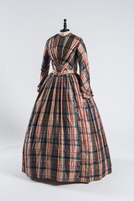 Das Oberteil ist eng anliegend mit langem, glattem, glockenförmigem Schoß. Die Weste ist kürzer als der Schoß und wird mit Haken verschlossen. Die Ärmel liegen bis zum Ellenbogen eng an und werden dann sehr weit ausladend. Aus den Ärmeln heraus ragen faltenreiche Spitzenvolants, Der Halsausschnitt ist viereckig und ebenfalls mit Spitze verziert. Der Rock ist faltenreich und glockenförmig. Der Seidenstoff ist hellblau und mit einem Muster aus Blüten und Blättern verziert. Getragen von Josefine Jordan, geb. von Stengel (1789-1834).