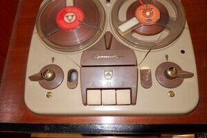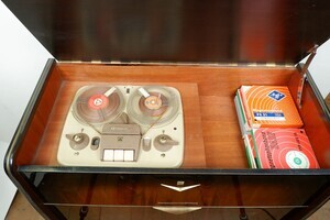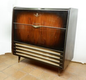 Diese Musiktruhe wurde in den Jahren 1958/1959 von Grundig in Fürth gebaut. Das Holzgehäuse ist dunkel, Hochglanz lackiert. Die 14 cm hohen Füße, ermöglichen eine gute Bedienbarkeit der Einbaugeräte. Durch das Öffnen des Gehäusedeckels, wird der standardmäßig eingebaute Plattenspieler sichtbar. Auf Wunsch wurde der Musikschrank K 21 auch mit einem Tonband ausgeliefert, so wie bei unser Modell. Leider ist das Tonband nicht mehr betriebsbereit. Der ehemalige Besitzer hat jedoch 4 bespielte Bänder und mehrere (Reserve) Antriebsriemen zurückgelassen. Das Radio wird zum Betrieb ca. 20 cm weit vorn ausgeklappt und ist so von oben bedienbar Dazu sind 6 Elfenbeinfarbene Drucktasten, (Wellenbereiche, Ein/Aus und Tonabnehmer) vorhanden, sowie zwei große Drehregler für die Senderabstimmung bzw. zur Regelung der Lautstärke. Ergänzend sind noch zwei weitere Drucktasten zu nennen, mit denen das Klangbild für Sprache bzw. Musik beeinflusst werden kann. Auf UKW läuft das Radio heute noch einwandfrei. Das hochglanzpolierte Gehäuse zeigt einige Gebrauchsspuren. Mehrere tiefe Kratzer und leichte Feuchtigkeitsschäden an den Seiten, sind da zu nennen. Der frühere Besitzer hat im Innern einige Veränderungen vorgenommen, die durch gekappte Kabel sichtbar werden. Der Ladenpreis lag 1958 bei 618.00 DM