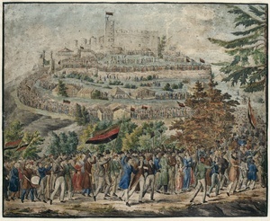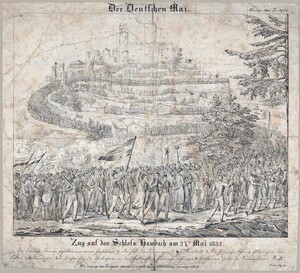 Die Grafik zeigt den Zug auf Hambacher Schloss am 27. Mai 1832. Das als "Hambacher Fest" berühmt gewordene politische Ereignis gilt als eine der Geburtsstunden von Demokratie und Nationalbewusstsein in Deutschland. Es handelt sich um die offenkundig einzig erhalten gebliebene, nicht beschnittene Lithographie mit der Darstellung des Festzuges auf das Hambacher Schloss. Auch die weitaus bekanntere colorierte Federlithographie (HMP_BS_0690), die in keinem Schulbuch fehlt, geht auf diese Vorlage zurück. Das Blatt, das - ausweislich der Betitelung - ausdrücklich als "Beilage zum Zeitgeist" herausgebracht wurde, bietet anhand der erhalten gebliebenen Randlegenden guten Aufschluss über einige Aspekte des Hambacher Festes. Auf dem Blatt finden sich Nummern von 1 bis 8, die wichtige Hinweise geben. In der Transkription lauten sie: "1.) Das deutsche Banner gehalten von einem Festordner 2.) Das Zelt der Bürgergarde von Neustadt 3.) Die Polnische Fahne 4.) Eingang in das Schloß 5.) Rednerbühne 6.) Tischreihen für die Theilnehmer an dem Festmahle 7.) Polnische Officiere 8.) Hütten und Zelte der Restaurateurs u. Wirthe". (Das zweite Digitalisat im Abbildungsfeld enthält die zeilengenaue Transkription.) / Die politische Zeitschrift °Der Zeitgeist. neue Carlsruher Zeitung. Volksblatt für Deutschland° erschien ab dem 14. Juni 1832 mit einer ersten Probenummer in Karlsruhe und wurde von Karl Friedrich Wilhelm Mathy (* 17. März 1807 in Mannheim; † 3. Februar 1868 in Karlsruhe) redigiert. Herausgeber und Drucker war Wilhelm Hasper. Der "Zeitgeist" wurde wegen der unmittelbar nach dem Hambacher Fest einsetzenden politischen Repression zeitweilig verboten. Schon 1834 musste die Zeitschrift gänzlich eingestellt werden. Soweit bekannt, befinden sich Einzelexemplare heute nur noch im Bundesarchiv in Berlin-Lichterfelde. [Ludger Tekampe]