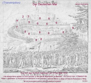 Die Grafik zeigt den Zug auf Hambacher Schloss am 27. Mai 1832. Das als "Hambacher Fest" berühmt gewordene politische Ereignis gilt als eine der Geburtsstunden von Demokratie und Nationalbewusstsein in Deutschland. Es handelt sich um die offenkundig einzig erhalten gebliebene, nicht beschnittene Lithographie mit der Darstellung des Festzuges auf das Hambacher Schloss. Auch die weitaus bekanntere colorierte Federlithographie (HMP_BS_0690), die in keinem Schulbuch fehlt, geht auf diese Vorlage zurück. Das Blatt, das - ausweislich der Betitelung - ausdrücklich als "Beilage zum Zeitgeist" herausgebracht wurde, bietet anhand der erhalten gebliebenen Randlegenden guten Aufschluss über einige Aspekte des Hambacher Festes. Auf dem Blatt finden sich Nummern von 1 bis 8, die wichtige Hinweise geben. In der Transkription lauten sie: "1.) Das deutsche Banner gehalten von einem Festordner 2.) Das Zelt der Bürgergarde von Neustadt 3.) Die Polnische Fahne 4.) Eingang in das Schloß 5.) Rednerbühne 6.) Tischreihen für die Theilnehmer an dem Festmahle 7.) Polnische Officiere 8.) Hütten und Zelte der Restaurateurs u. Wirthe". (Das zweite Digitalisat im Abbildungsfeld enthält die zeilengenaue Transkription.) / Die politische Zeitschrift °Der Zeitgeist. neue Carlsruher Zeitung. Volksblatt für Deutschland° erschien ab dem 14. Juni 1832 mit einer ersten Probenummer in Karlsruhe und wurde von Karl Friedrich Wilhelm Mathy (* 17. März 1807 in Mannheim; † 3. Februar 1868 in Karlsruhe) redigiert. Herausgeber und Drucker war Wilhelm Hasper. Der "Zeitgeist" wurde wegen der unmittelbar nach dem Hambacher Fest einsetzenden politischen Repression zeitweilig verboten. Schon 1834 musste die Zeitschrift gänzlich eingestellt werden. Soweit bekannt, befinden sich Einzelexemplare heute nur noch im Bundesarchiv in Berlin-Lichterfelde. [Ludger Tekampe]