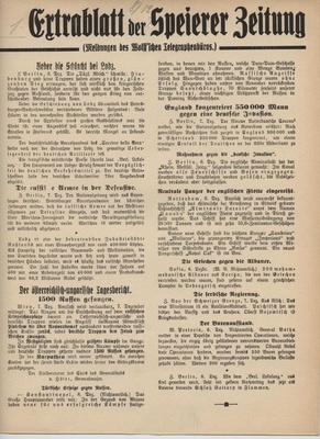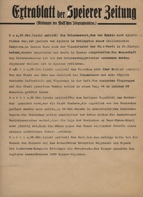Telegramme der "Pfälzer Zeitung" und des "Rheinischen Volksblattes" vom 16. März 1915. (Nachrichten des Wolff’schen Telegraphen-Büro.) Das Historische Museum besitzt 457 Telegramme aus dem Zeitraum vom 26. Oktober 1914 bis zum 31. Juli 1915 (HM_0_12314 bis HM_0_12779). Bei Interesse wenden Sie sich bitte an das Historische Museum.