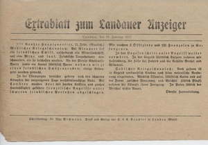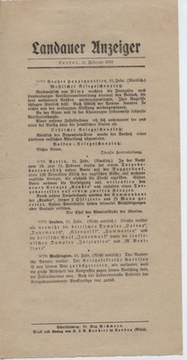 Nachrichtenblatt "Landauer Anzeiger" vom 16. Oktober 1916; Schriftleitung: Dr. Max Wichmann. Druck und Verlag von R. & U. Kaußler in Landau (Pfalz). Das Historische Museum besitzt 180 Nachrichtenblätter des Landauer Anzeigers aus dem Zeitraum vom 11. Februar 1916 bis zum 22. Januar 1917 (HM_0_12784 bis HM_0_12963) Bei Interesse wenden Sie sich bitte an das Historische Museum.