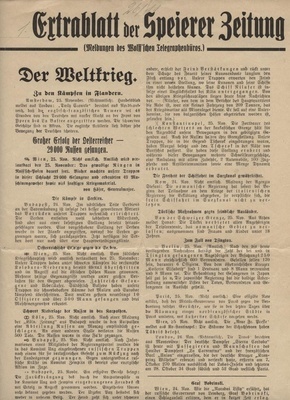 1. Extrablatt der Speierer Zeitung vom 8. Dezember 1914 (Meldungen des Wolff’schen Telegraphenbüros.) Das Historische Museum besitzt 148 Nachrichtenblätter der Speierer Zeitung aus dem Zeitraum vom 25. Oktober 1914 bis zum 16. Januar 1915 (HM_0_12166 bis HM_0_12313). Bei Interesse wenden Sie sich bitte an das Historische Museum.