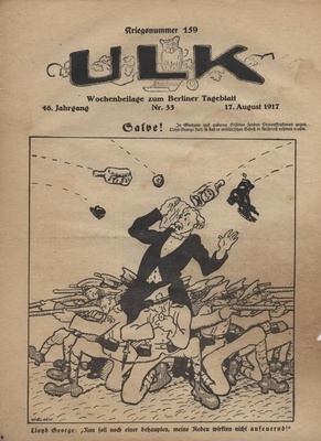 "Ulk. Wochenbeilage zum Berliner Tageblatt" Kriegsnummer 18, 43. Jahrgang, Nr. 49, 4. Dezember 1914, 8 Seiten (HM_0_12971) Kriegsnummer 145, 46. Jahrgang, Nr. 19, 11. Mai 1917, 8 Seiten (HM_0_12974) Kriegsnummer 146, 46. Jahrgang, Nr. 20, 18. Mai 1917, 8 Seiten (HM_0_12975) Kriegsnummer 147, 46. Jahrgang, Nr. 21, 25. Mai 1917, 8 Seiten (HM_0_12976) Kriegsnummer 148, 46. Jahrgang, Nr. 22, 1. Juni 1917, 8 Seiten (HM_0_13017) Kriegsnummer 149, 46. Jahrgang, Nr. 23, 8. Juni 1917, 8 Seiten (HM_0_13018) Kriegsnummer 150, 46. Jahrgang, Nr. 24, 15. Juni 1917, 8 Seiten (HM_0_13019) Kriegsnummer 151, 46. Jahrgang, Nr. 25, 22. Juni 1917, 8 Seiten (HM_0_13020) Kriegsnummer 152, 46. Jahrgang, Nr. 26, 29. Juni 1917, 8 Seiten (HM_0_13021) Kriegsnummer 153, 46. Jahrgang, Nr. 27, 6. Juli 1917, 4 Seiten (HM_0_13022) Kriegsnummer 154, 46. Jahrgang, Nr. 28, 13. Juli 1917, 4 Seiten (HM_0_13023) Kriegsnummer 155, 46. Jahrgang, Nr. 29, 20. Juli 1917, 4 Seiten (HM_0_13024) Kriegsnummer 156, 46. Jahrgang, Nr. 30, 27. Juli 1917, 4 Seiten (HM_0_13025) Kriegsnummer 157, 46. Jahrgang, Nr. 31, 3. August 1917, 4 Seiten (HM_0_13026) Kriegsnummer 158, 46. Jahrgang, Nr. 32, 10. August 1917, 4 Seiten (HM_0_13027) Kriegsnummer 159, 46. Jahrgang, Nr. 33, 17. August 1917, 4 Seiten (HM_0_13028) Druck und Verlag von Rudolf Mosse in Berlin.