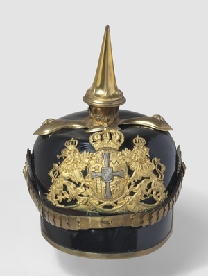 Helm des Kgl. Bayerischen Chevauleger-Regiments mit Helmschachtel und Gepäckschein. Abschraubbare, gekehlte Spitze, deren Spitzenhals mit Perlringen besetzt ist, sitzt auf Kreuzblattbeschlag, welcher mit Sternschrauben am Helm befestigt ist. Großer Zierat mit zwei, das bayerische Wappen umfassenden bayerischen Löwen und Lorbeerzweigen. Reserveoffiziere legten auf dem ovalen Wappen das versilberte Landwehrkreuz an. Wappen gekrönt. Der große Zierat mit Lorbeerzweigen wurde 1914 durch den kleinen Zierat der Fußtruppen ersetzt. Darunter Spruchband "In Treue fest". Eckiger Vorderschirm, mit gewölbten Schuppenketten besetzter Kinnriemen, welcher an den Helmseiten an Deutscher (schwarz-weiß-rot) und Bayerischer Kokarde (blau-weiß) angebracht wurden. Offiziershelme hatten versilberte oder vergoldete Beschläge. Vorderschirm dunkelgrün und Hinterschirm rot gefüttert. Geteiltes Futter aus hellen Seidenrips, befestigt am ledernen Schweißband.