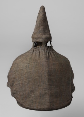 Helm mit Helmschachtel und schilfgrünem Tarnüberzug. Mittels Drehgewinde abnehmbare Helmspitze mit individueller Spitzenlänge auf rundem Aufsatz, welcher mit Sternschrauben am Helm befestigt ist. Spitzenhals mit Perlring verziert. Zierrat mit gekröntem preußischem Linienadler (Wappenadler), dem gewöhnlichen Adler der preußischen Linienregimenter, mit Zepter und Reichsapfel. Darunter Spruchband/Devisenband "Mit Gott für König und Vaterland". Initiale "FR" (Fredericus Rex) mittig. Kinnriemen mit Schuppenketten besetzt und an den Helmseiten an Deutscher (schwarz-weiß-rot) und Preußischer Kokarde (schwarz-weiß) befestigt. Runder Vorderschirm und metallenes Band, welches sich über den hinteren Teil von Spitzenaufsatz bis zum Hinterschirmende zieht. Vorderschirm dunkelgrün und Hinterschirm rot gefüttert. Geteiltes Futter aus grünem Seidenrips, befestigt am ledernen Schweißband. Schilfgrüner Tarnüberzug am Vorder- und Hinterschirm mit taschenförmigen Steifeinlagen versehen. Initiale D.R.P. befinden sich an der Innenseite des Hinterschirms.