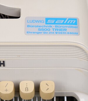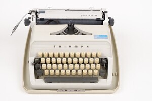 Die Triumph Werke Nürnberg AG wurden 1896 von Siegfried Bettmann gegründet. Hergestellt wurden Motorräder, Fahrräder und Büromaschinen. Im Jahr 1956 übernahm Max Grundig erst die Aktienmehrheit der Triumph Werke, 1 Jahr danach, noch die Adler Werke. 1968 verkaufte er Triumph-Adler an den amerikanischen Litton-Konzern. Die Schreibmaschine „Triumph Gabriele“ ist nach Max Grundigs Enkeltochter benannt. Produziert wurde sie zwischen 1965 – 1979. Die Maschine ist in ein hellbeiges Plastikgehäuse eingebaut. Technisch handelt es sich um eine Typenhebel Maschine mit Wagnergetrieben und Segmentumschaltung. Ausgestattet ist das Modell u.a. mit einer Zeilenschaltung, 4 Reihiger QWERT Tastatur, Farbbandumschalter, Randlöser und automatischer Bandumschaltung. Der Anschlag ist angenehm weich. Auf der Rückseite ist ein Aufkleber mit dem Aufdruck " T-A Vertriebs GMBH" An den Endverbraucher verkauft, wurde die Maschine durch das Bürohaus Ludwig Salm, aus Trier. Zu der Schreibmaschine gehört ein fester, beigefarbenen Plastikkoffer.