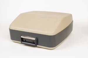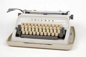 Die Triumph Werke Nürnberg AG wurden 1896 von Siegfried Bettmann gegründet. Hergestellt wurden Motorräder, Fahrräder und Büromaschinen. Im Jahr 1956 übernahm Max Grundig erst die Aktienmehrheit der Triumph Werke, 1 Jahr danach, noch die Adler Werke. 1968 verkaufte er Triumph-Adler an den amerikanischen Litton-Konzern. Die Schreibmaschine „Triumph Gabriele“ ist nach Max Grundigs Enkeltochter benannt. Produziert wurde sie zwischen 1965 – 1979. Die Maschine ist in ein hellbeiges Plastikgehäuse eingebaut. Technisch handelt es sich um eine Typenhebel Maschine mit Wagnergetrieben und Segmentumschaltung. Ausgestattet ist das Modell u.a. mit einer Zeilenschaltung, 4 Reihiger QWERT Tastatur, Farbbandumschalter, Randlöser und automatischer Bandumschaltung. Der Anschlag ist angenehm weich. Auf der Rückseite ist ein Aufkleber mit dem Aufdruck " T-A Vertriebs GMBH" An den Endverbraucher verkauft, wurde die Maschine durch das Bürohaus Ludwig Salm, aus Trier. Zu der Schreibmaschine gehört ein fester, beigefarbenen Plastikkoffer.