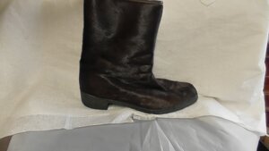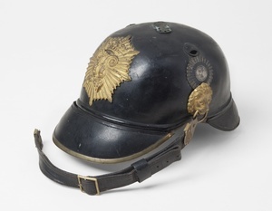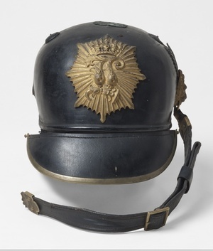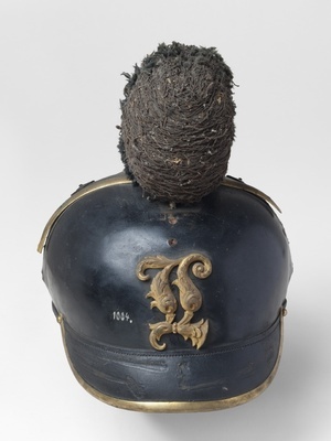 Sog. Raupenhelm, welcher 1886 durch die Pickelhaube abgelöst wurde. Raupe fehlt. Sternförmiges Emblem mit beköntem Namenszug König Ludwigs (L) von Bayern an der Stirnseite. Lederner Kinnriemen an der rechten Seite an Löwenkopf befestigt. Darüber bayerische Landeskokarde (weiß-blau) mit Namenszug (L) in der Mitte. Runder Schirm vorne, eingefasst von Messingband und schwarz gefüttert. Nackenschirm rot gefüttert.