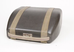 Die Adlerwerke vorm. H. Kleyer AG aus Frankfurt waren ein deutsches Fahrzeug- und Maschinenbauunternehmen mit Sitz in Frankfurt am Main. Hergestellt wurden Fahrräder, Autos, Motorräder und zuletzt, bis 1998, Büromaschinen. Im Jahr 1957 kaufte Max Grundig die Adlerwerke. Die Motorradfertigung wurde eingestellt und Adler wurde mit dem ebenfalls Grundig gehörenden Nürnberger Motorrad- und Büromaschinenbauer "Triumph" zusammengeschlossen. Produziert wurden nunmehr ausschließlich Büromaschinen unter dem Fabrikat "Triumph-Adler". Unsere Adler Schreibmaschine, mit der Produktionsnummer 3.015.694 wurde etwa 1954 hergestellt. Das Maschinengehäuse besteht aus grau/beigen Plastik. Technisch handelt es sich um eine Typenhebel Maschine mit Wagnergetrieben und Segmentumschaltung. Ausgestattet ist das Modell u.a. mit einer Zeilenschaltung, 4 Reihiger QWERT Tastatur, Farbbandumschalter, Randlöser und automatischer Bandumschaltung. Stabiler Transportkoffer aus Plastik, aus dem sich die Maschine leicht herausnehmen lässt. Leider ist die Maschine nicht mehr Betriebsbereit, da der Wagen nicht transportiert wird.