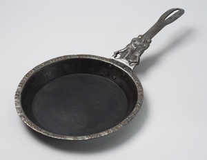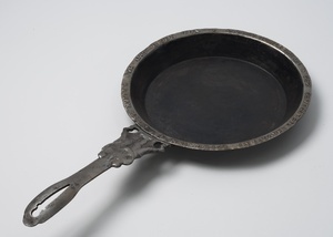 Ovale, gusseiserne Pfanne mit Pfannstiel, welcher einen Schlitz zum Aufhängen aufweist sowie ein Relief eines Soldaten und einer Frau zeigt, die sich gegenseitig die Hände reichen. Am Pfannenrand befindet sich ein reliefartig gearbeiteter, auf einer Breite von 4 cm umlaufender Spruchband: Hausfrau Opfersinn gab Kupfer für das Eisen hin, Weltkrieg 1916.