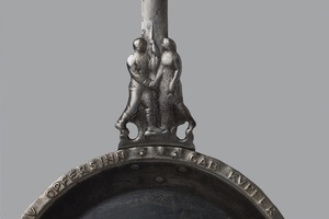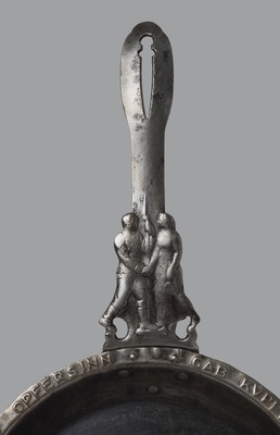 Ovale, gusseiserne Pfanne mit Pfannstiel, welcher einen Schlitz zum Aufhängen aufweist sowie ein Relief eines Soldaten und einer Frau zeigt, die sich gegenseitig die Hände reichen. Am Pfannenrand befindet sich ein reliefartig gearbeiteter, auf einer Breite von 4 cm umlaufender Spruchband: Hausfrau Opfersinn gab Kupfer für das Eisen hin, Weltkrieg 1916.