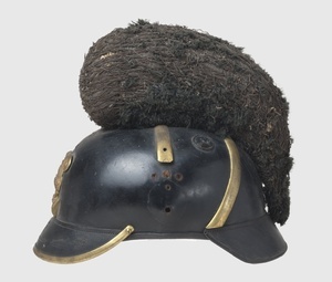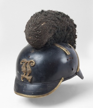 Sog. Raupenhelm, bei dem die Raupe noch erhalten ist. Raupe aus Leinwand, die über ein Peddingrohrgeflecht gezogen und mit Wollfransen benäht war. Am Helmkopf befindet sich seitlich jeweils ein verschließbares Lüftungsloch. Namenszug König Ludwigs (L) von Bayern, bei dem die übliche Bekrönung fehlt, an der Stirnseite. Kinnriemen und dessen Halterungen an den Schläfenseiten, für gewöhnlich Löwenköpfe über bayerischer Landeskokarde rechts und deutscher Kokarde links, fehlen beim vorliegenden Objekt. Runder Schirm vorne, eingefasst von Messingband und schwarz gefüttert. Nackenschirm rot gefüttert. Der Helm selbst ist noch das 1868 festgelegte Modell. Getragen wurde das vorliegende Helmmodell auch als Offiziershelm bis 1887, die Mannschaften ersetzten ihren Raupenhelm erst 1890 durch die sogenannte Pickelhaube. Die Helme für Offiziere und Unteroffiziere hatten anstatt einer mit Wollfransen benähten Raupe, eine Raupe aus Bärenfell und anstatt eines stehenden Busches aus Rosshar, einen stehenden Busch aus Straußenfedern.