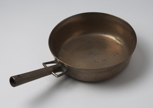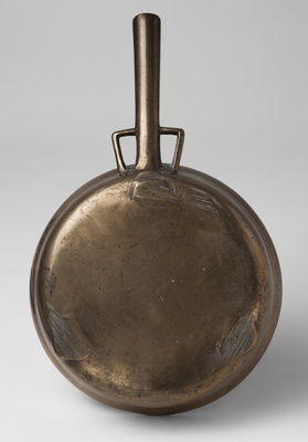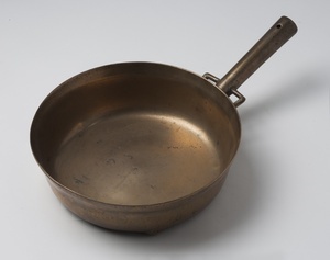 Bei der Stielpfanne aus Bronzeguss sind am Boden die drei ehemals vorhandenen Standfüße abgetrennt worden. Die Pfanne war demnach ursprünglich für die Zubereitung von Speisen auf dem offenen Herdfeuer eingerichtet. Es handelt in der Ursprungsform um einen sogenannten Stielgrapen. Diese Form der auf drei Füßen stehenden Kochgefäße ist in Mitteleuropa seit dem 12. Jahrhundert überliefert. Die meisten Grapen wurden aus Hafnerkeramik und Eisen hergestellt. Bei dieser Pfanne aus massivem Bronzeguss dürfte es sich ursprünglich um ein Küchengerät aus einem reichen Adels- oder Bürgerhaushalt des ausgehenden 17. Jahrhundert handeln. Bronzepfannen wurden besonders gern für bei niedrigen Temperaturen zuzubereitende Süßspeisen genutzt. In vermögenden Haushaltungen der Pfalz setzte sich seit der Mitte des 18. Jahrhunderts der geschlossene Herd durch. Hier waren nun die ursprünglichen Füße des Grapens hinderlich, weshalb davon auszugehen ist, dass die Entfernung der Füße ab etwa 1750 erfolgt sein muss. / Die Pfanne entging den Metallsammlungen des Ersten Weltkrieges, weil sie 1916 bei der Reichsmetallsammelstelle im Bezirksamt St. Ingbert auf Grund ihres Alters und ihrer Seltenheit als aufbewahrenswertes Kulturgut ausgesondert wurde. So gelangte sie in die Kriegssammlung des Historischen Museums der Pfalz. [Ludger Tekampe]