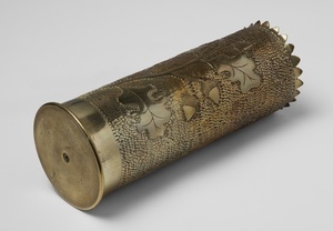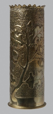 Leere Granathülse; über dem Boden glatte, polierte Fläche, Eichentrieb mit vier Blättern und 5 Eicheln, größtententeils punziert, oberer Rand mit 23 Zacken; Boden: Nov. 1917, Patronenfabrik Karlsruhe, St 421, 67% Cu, Sp255. Erworben 2013 im Museumsshop des "Musée Somme 1916" der Stadt Albert (Albert ist eine französische Gemeinde mit 10.054 Einwohnern im Département Somme in der Region Hauts-de-France.).