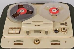 Ein schweres, Röhrenbestücktes Tonbandgerät von AEG aus den Jahren 1959/1960. In einem formschönen Koffer mit farbigem Kunstlederbezug präsentiert sich die elegante Ausführung des Magnetophon 85. Zwei große Vollklang-Lautsprecher vermitteln eine gute Tonwiedergabe. Zu den klassischen Bedienelementen eines Tonbandgerätes gehören auch getrennte Klangfarbenregler für die hohen und tiefen Töne. Bei Aufnahmen kann mit dem eingebauten Lautsprecher mitgehört werden. Zwei Bandgeschwindigkeiten 9,5 und 19 cm/s im Doppelspurverfahren stehen zur Verfügung. Anschlüsse für Kopfhörer, Radio, Zusatzlautsprecher und Plattenspieler befinden sich auf der Rückseite.