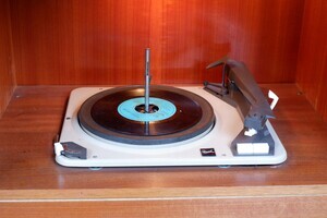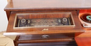 Metz war immer ein mittelständiger Betrieb mit innovativen Ideen und hat als einer der wenigen Rundfunkgerätehersteller in Deutschland die Eigenständigkeit bewahrt und im 21. Jahrhundert noch produziert. Metz wurde 1938 als Transformator- und Apparatebau (TAM in Zirndorf/Fürth gegründet. 1947 erfolgte die Umbenennung in Metz-Werke GmbH & Co KG, Fürth. Radios wurden bis 1965 produziert, danach nur noch Fernseher. Metz der einzige Familienbetrieb, der im Bereich Unterhaltungselektronik überlebt hat. Unser Musikschrank, vermutlich aus dem Jahr 1954, ist ein stattliches Möbelstück mit 1,20 Breite. Der Korpus ist größten Teils aus Massivholz und dunkel furniert. Auf der Vorderseite sind zwei verschlossene Öffnungen. Hinter der linken Tür befindet sich das Radio. Zum Betrieb wird es ca. 20 cm weit vorn ausgeklappt und ist so von oben bedienbar. Das Bedienfeld hat 6 elfenbeinfarbene Drucktasten, (Wellenbereiche, Ein/Aus und Tonabnehmer, sowie zwei große Drehregler für die Senderabstimmung bzw. zur Regelung der Lautstärke. Ergänzend sind noch zwei weitere Drucktasten zu nennen, mit denen das Klangbild für Sprache bzw. Musik beeinflusst werden kann. Auf UKW läuft das Radio heute noch einwandfrei. Hinter der rechten Tür befindet ein beleuchtetes Fach, in das ein Dual 10er Wechsler eingebaut ist. Leider hat die Mechanik einen Defekt, der das Abspielen von 33er, 45er und 78 Platten verhindert. Auf der Rückseite gibt es eine 220V Steckdose, über die der Plattenspieler mit Strom versorgt werden kann. Externe Anschlüsse gibt es für den Plattenspieler, Lautsprecher und Antenne.