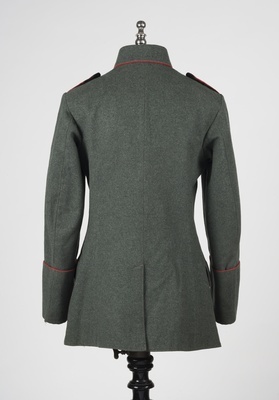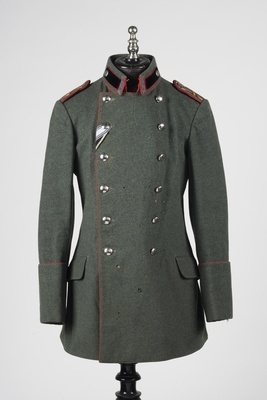 Kleiner Rock M 1915, eines Leutnants des 2. bayerischen Pionierbataillons, Speyer, Nachfolger der Offizierslitewka, feldgrau, schräge Taschen; Klappkragen, Kragenpatten mit angedeuteter weiß-blauer Rautenborte, schwarzer Samt mit ponceauroten Vorstößen und silbernem Knopf; Achselstück mit, von hellblauen Seidenfäden durchzogenen, silbernen Plattschnüren, goldene Nr. 2, Unterlage aus schwarzem Samt mit ponceaurotem Vorstoß; doppelte Knopfreihe mit je 6 silbernen Knöpfen, linksöffnend; Band zum bayerischen Militärverdienstkreuz (weiß-blau) und Band zum preußischen Eisernen Kreuz (schwarz-weiß) im obersten Knopf der linken Reihe; Ärmelaufschlag?