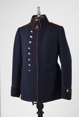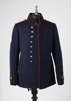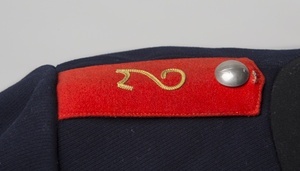 Blauer Friedensrock eines Offiziers des 2. bayerischen Pionierbataillons, Speyer; Der blaue Friedensrock wurde bis zum 21.09.1915 hergestellt und danach von dem feldgrauen Friedensrock ersetzt; Stehkragen aus schwarzem Samt mit ponceaurotem Vorstoß; rote Schulterklappen mit goldener Ziffer 2, silberner Knopf mir Ziffer 1; 8 silberne Knöpfe, linksöffnend; Schwedischer Ärmelaufschlag aus schwarzem Samt mit ponceaurotem Vorstoß.