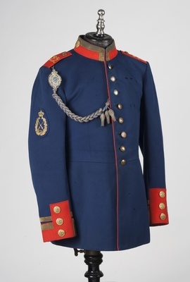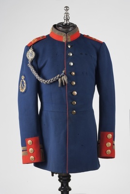 Blauer Waffenrock eines Unteroffiziers des 22. Bayerischen Infanterie-Regiments, Zweibrücken, welches 1897 aufgestellt wurde. Stehkragen mit Unteroffizierstresse in Gold, Auszeichnungsknopf/Waffenknopf in Gold mit bayerischem Löwen auf rotem Samt. Der Auszeichnungsknopf weißt den Träger als Sergeant aus (höchster Unteroffiziersgrad); Schulterklappe aus roten Patten ohne Vorstoß, goldener Knopf mit Nr. 7, Nr. 22 in Gelb; Kaiserabzeichen von 1898 am rechten Ärmel; Ab 1895 wurde das Kaiserabzeichen innerhalb eines Armeekorps an Kompanien mit den besten Leistungen im Gefechtsschiessen verliehen; 8 goldene Knöpfe, linköffnend; Schützenabzeichen in Form einer Fangschnur am dritten Knopf von Oben, blau-silberne Seidenfäden, 3 Eicheln, bayerisches Wappen; Brandenburgischer Ärmelaufschlag aus rotem Samt mit je 3 Auszeichnungsknöpfen (Bayerischer Löwe), goldene Unteroffizierstresse mit zusätzlich goldenem Band darüber.