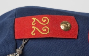 Blauer Waffenrock eines Unteroffiziers des 22. Bayerischen Infanterie-Regiments, Zweibrücken, welches 1897 aufgestellt wurde. Stehkragen mit Unteroffizierstresse in Gold, Auszeichnungsknopf/Waffenknopf in Gold mit bayerischem Löwen auf rotem Samt. Der Auszeichnungsknopf weißt den Träger als Sergeant aus (höchster Unteroffiziersgrad); Schulterklappe aus roten Patten ohne Vorstoß, goldener Knopf mit Nr. 7, Nr. 22 in Gelb; Kaiserabzeichen von 1898 am rechten Ärmel; Ab 1895 wurde das Kaiserabzeichen innerhalb eines Armeekorps an Kompanien mit den besten Leistungen im Gefechtsschiessen verliehen; 8 goldene Knöpfe, linköffnend; Schützenabzeichen in Form einer Fangschnur am dritten Knopf von Oben, blau-silberne Seidenfäden, 3 Eicheln, bayerisches Wappen; Brandenburgischer Ärmelaufschlag aus rotem Samt mit je 3 Auszeichnungsknöpfen (Bayerischer Löwe), goldene Unteroffizierstresse mit zusätzlich goldenem Band darüber.