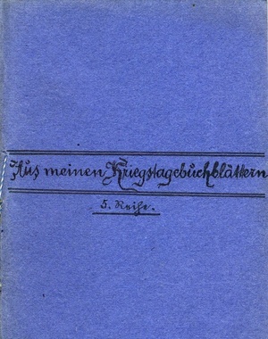 "Aus meinen Kriegstagebuchblättern V.", "poetische Versuche in gebundener Form; von Edmund Langenbrunner, Volksschullehrer in Enkenbach, Pfalz, zur Zeit des großen Völkerkrieges 1914-1918, dem herzlieben Vaterlande und all dessen braven Helden in höchster Verehrung und tiefster Dankbarkeit gewidmet, 5. Reihe"; 23 Kapitel in Versen, 72 Seiten