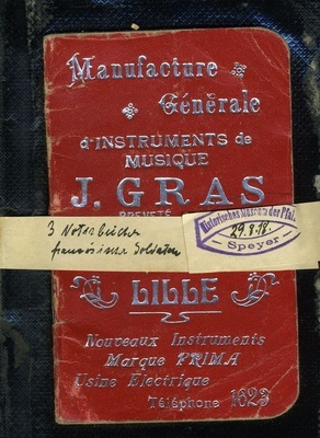 3 Notizbücher französischer Soldaten, mit Kalender von 1907, diverse Seiten mit Notizen und Notenblättern, sowie eine Postkarte von einer Laienschauspielertruppe aus Libourne: Aufführung: Jeanne d’Arc, 1910; hergestellt von Denis Simonet