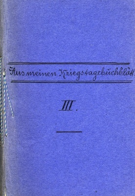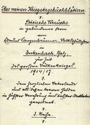 "Aus meinen Kriegstagebuchblättern III.", "poetische Versuche in gebundener Form; von Edmund Langenbrunner, Volksschullehrer in Enkenbach, Pfalz, zur Zeit des großen Völkerkrieges 1914/17, dem herzlieben Vaterlande und all dessen braven Helden in höchster Verehrung und tiefster Dankbarkeit gewidmet, 3. Reihe"; 21 Kapitel in Versen, 122 Seiten