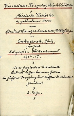 "Aus meinen Kriegstagebuchblättern II.", "poetische Versuche in gebundener Form; von Edmund Langenbrunner, Volksschullehrer in Enkenbach, Pfalz, zur Zeit des großen Völkerkrieges 1914/17, dem herzlieben Vaterlande und all dessen braven Helden in höchster Verehrung und tiefster Dankbarkeit gewidmet, 2. Reihe"; 16 Kapitel in Versen, 95 Seiten